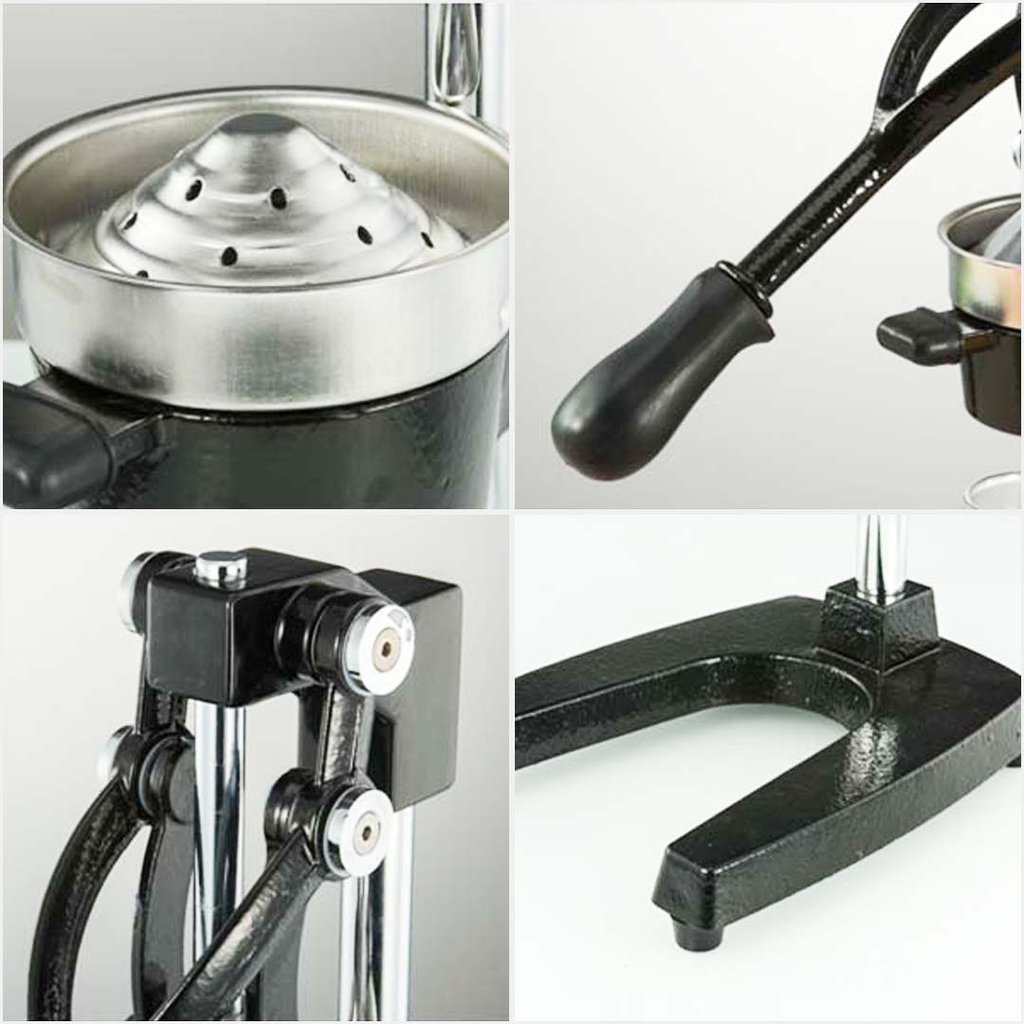 - Sturdy cast iron base with a large opening for juice collecting
